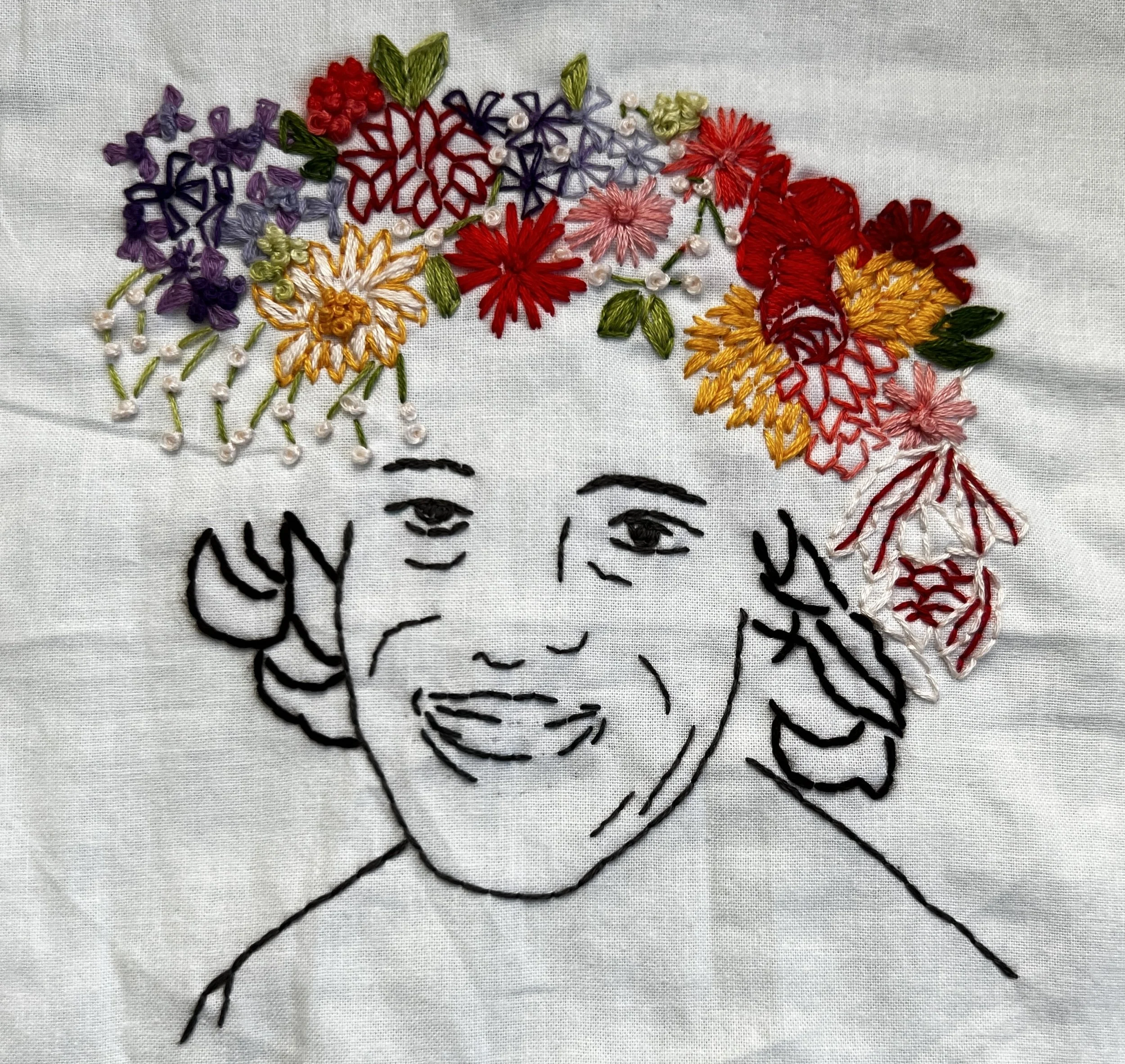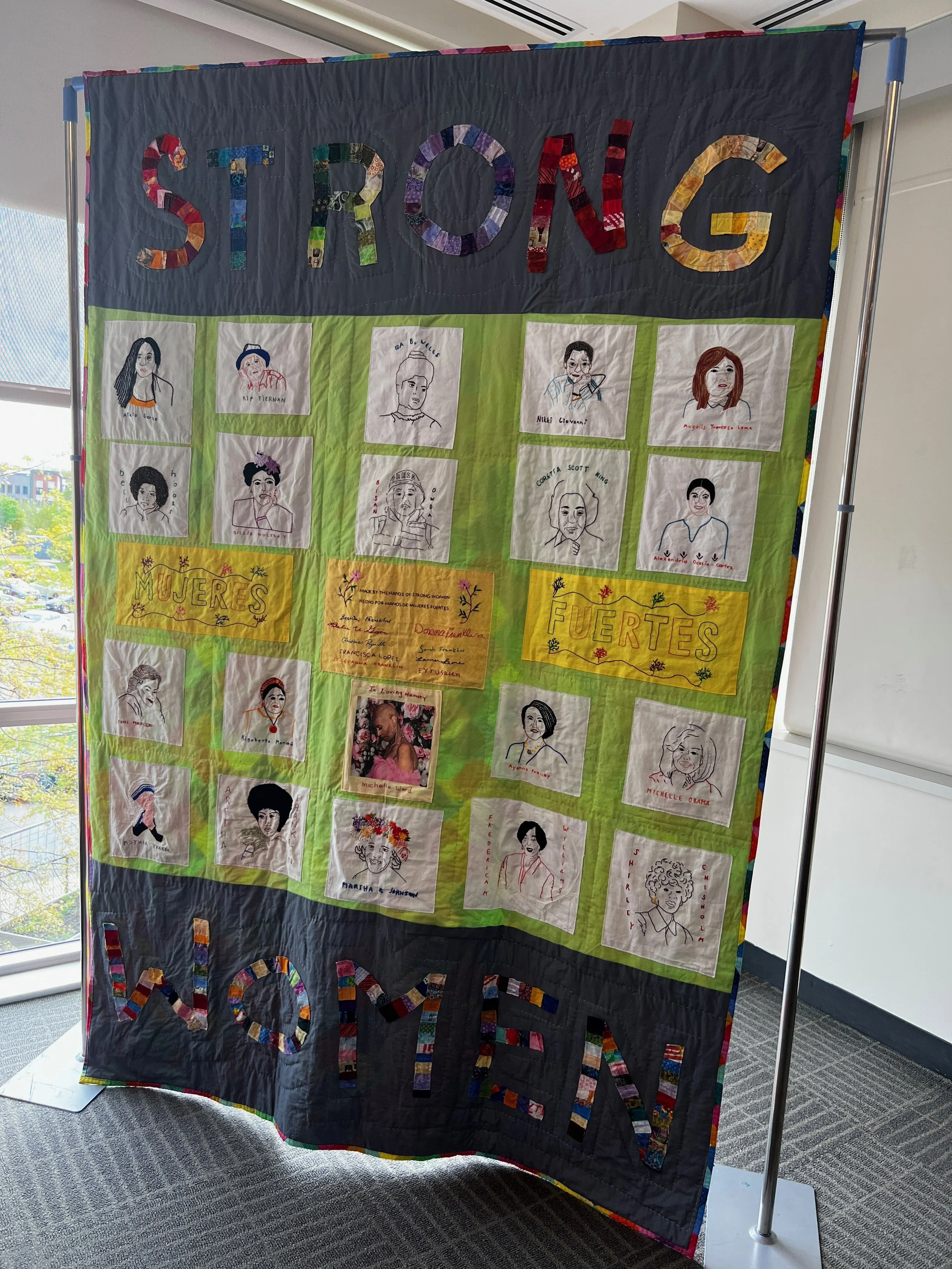 Strong Women is a collaborative quilt, made by the Crafting Change group, hand embroidery and appliqué. Group members embroidered portraits to pay homage to women of color who have inspired us through arts, politics, sports, social justice, and/or community organizing. Throughout our process, we discussed each of the potential portraits to include, leading us to tell stories, build knowledge, and share with each other about each proposed honoree’s accomplishments and the significance they hold for the individual who suggested adding them to our quilt.
